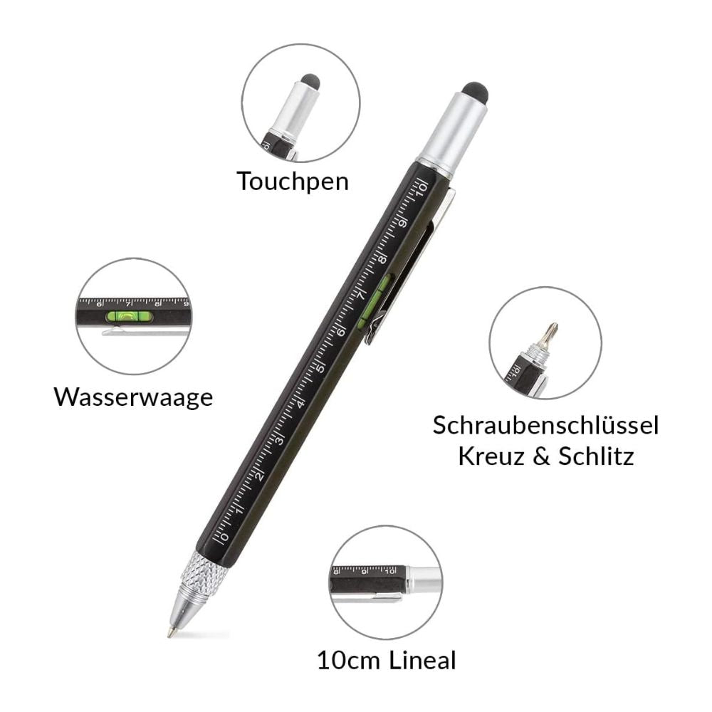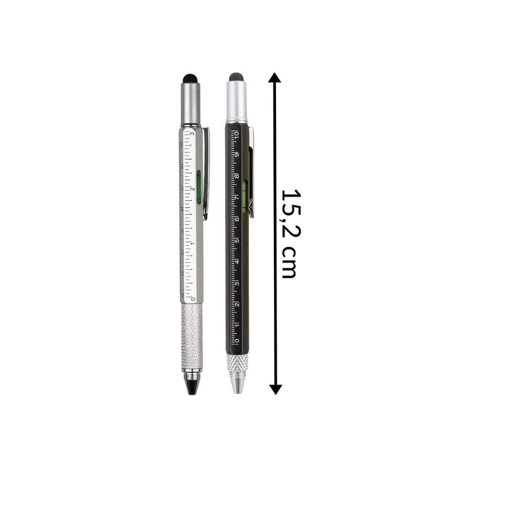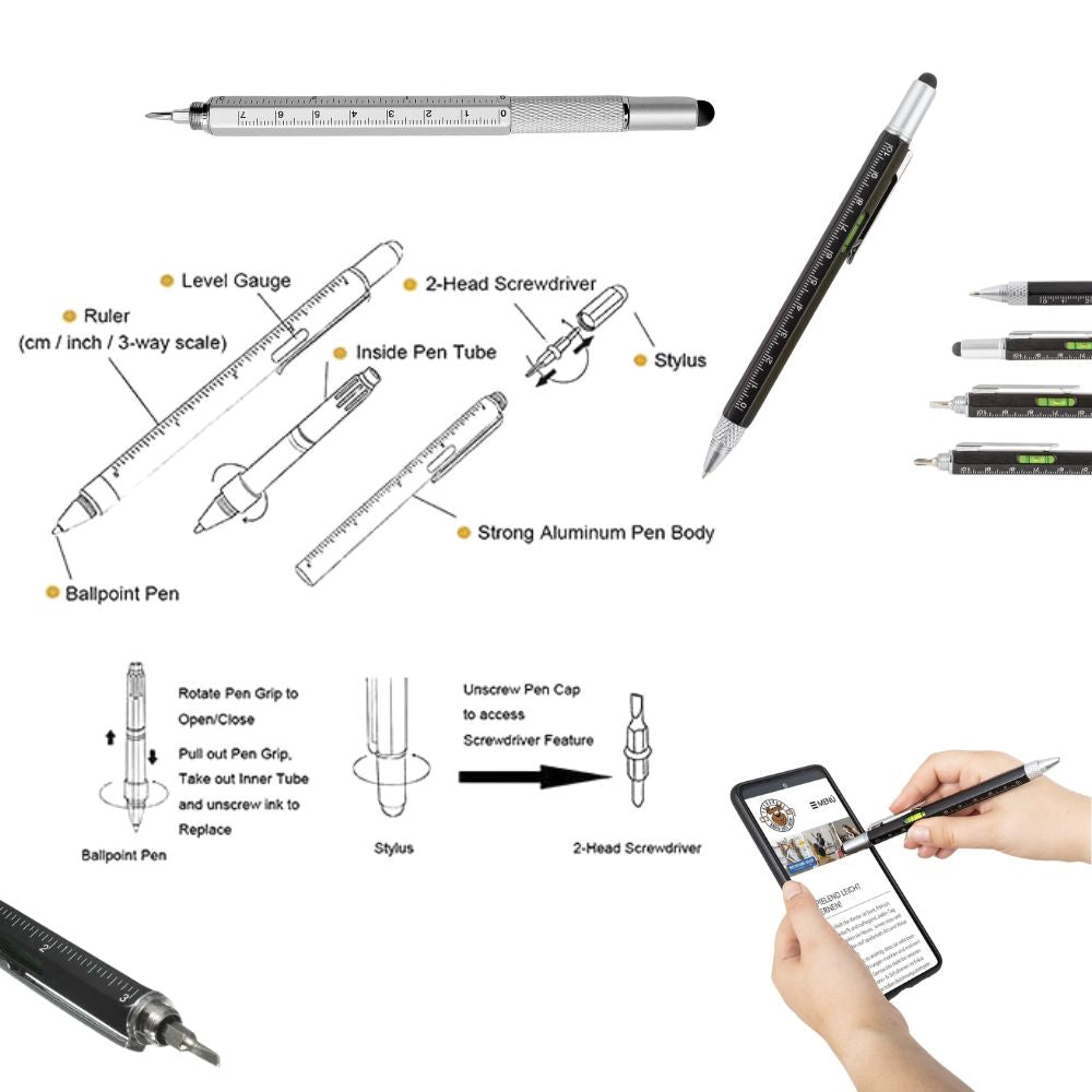 6-in-1 multifunctional pen: stylus touch pen, screwdriver (slotted + Phillips), ruler, spirit level, ballpoint pen