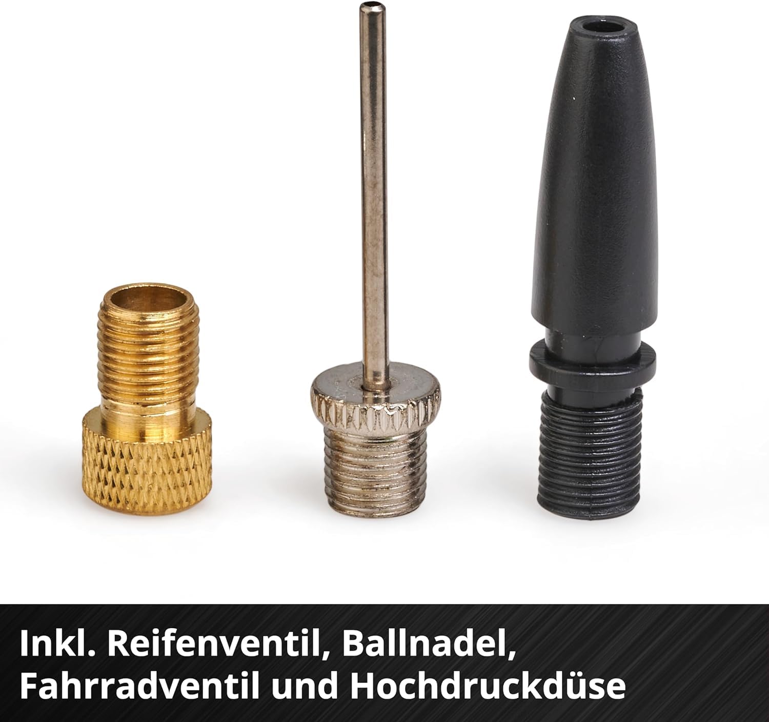 Includes ball needle, bicycle valve and high pressure nozzle , all stored directly on the device.