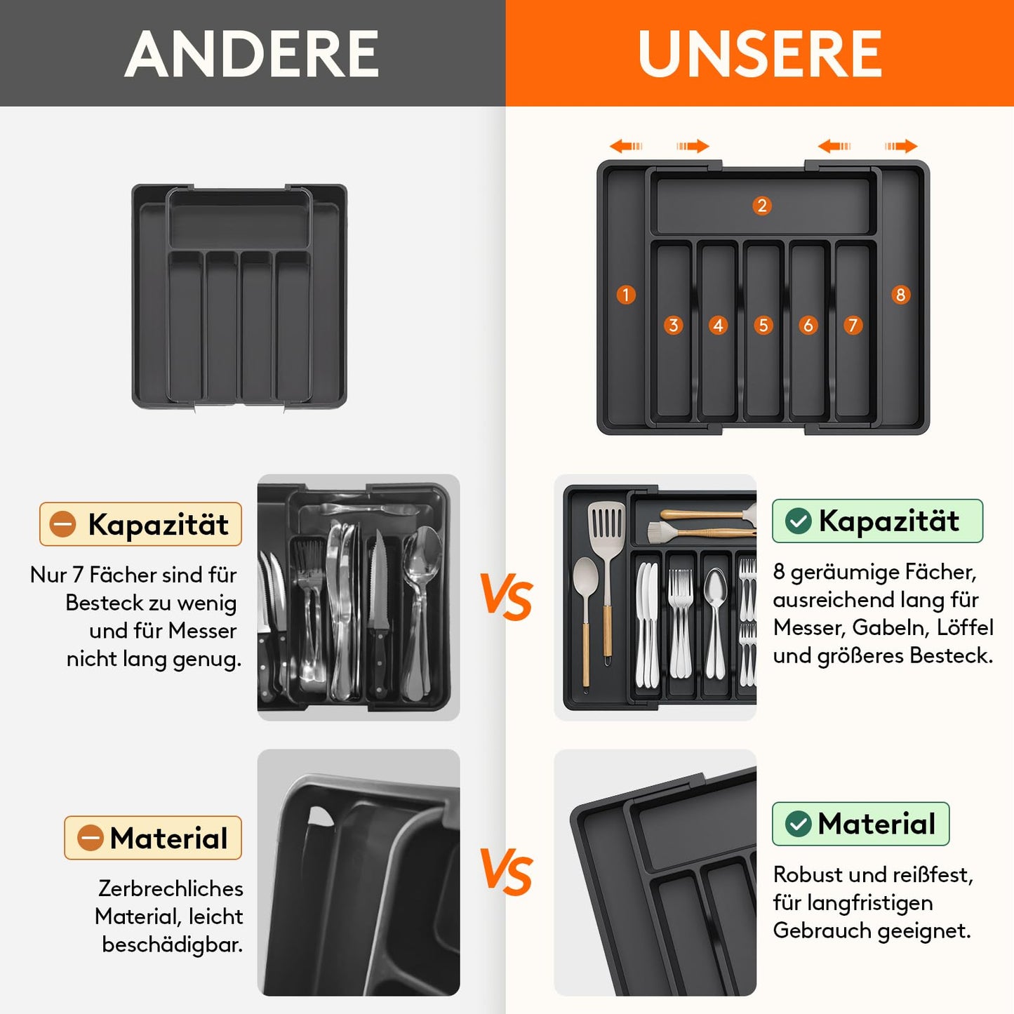 Large capacity : Expandable compartments for more storage space for cutlery and kitchen utensils