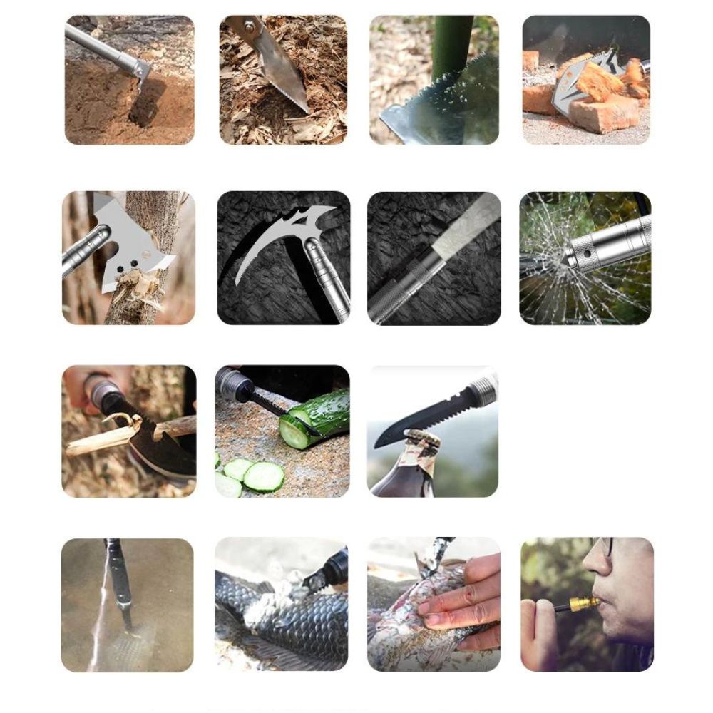 This sturdy and versatile shovel made from aluminum alloy combines numerous tools into one compact design, ready for any outdoor challenge.