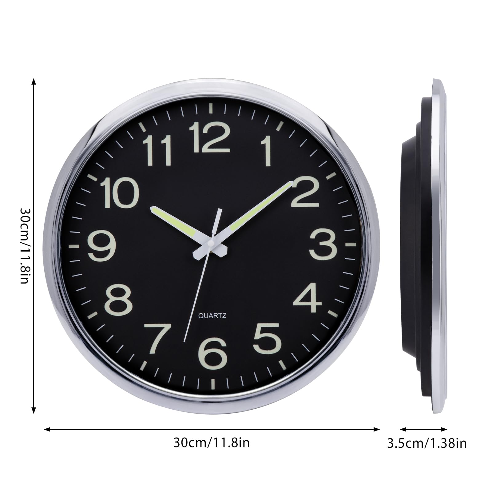 VINILITE Luminous Night Light Wall Clock (30cm) without ticking noise: Battery-operated for living room, bedroom, office