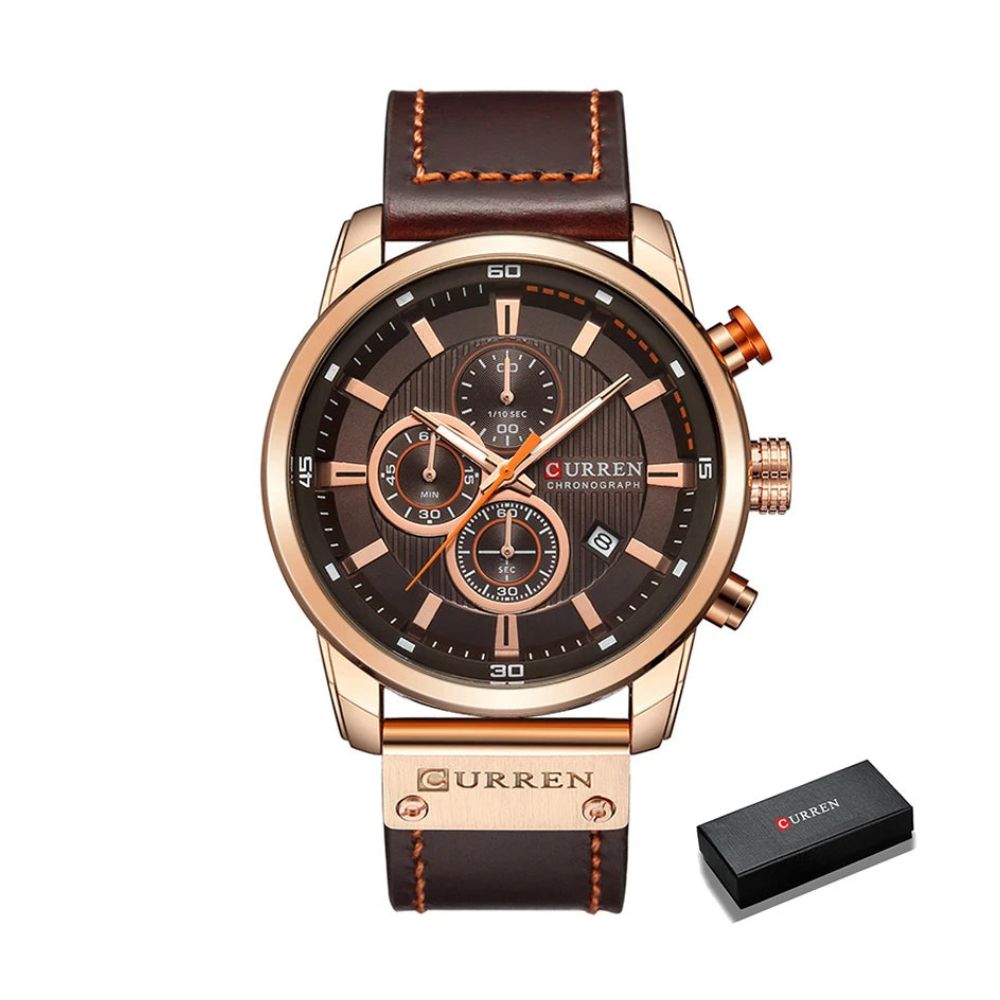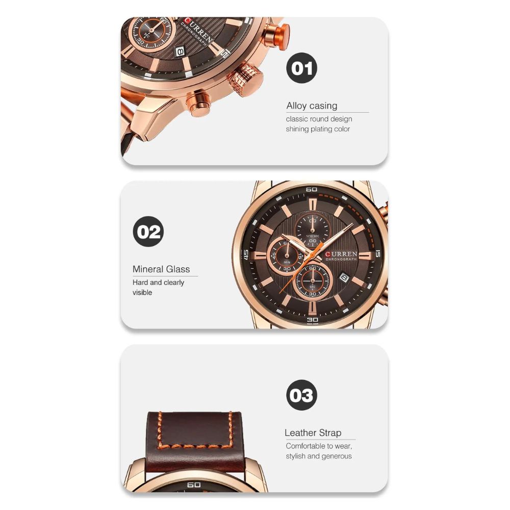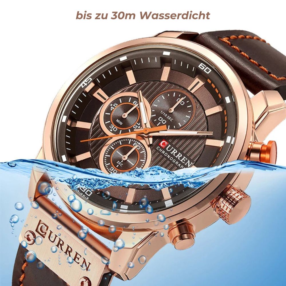 Mit einem robusten Gehäuse aus einer langlebigen Legierung und einem Armband aus echtem Leder bietet die CURREN Uhr ein luxuriöses Tragegefühl. Die Kombination aus modernem Chronographen-Stil und klassischer Quarzuhr-Technologie verleiht Ihnen sowohl Stil als auch Präzision.
