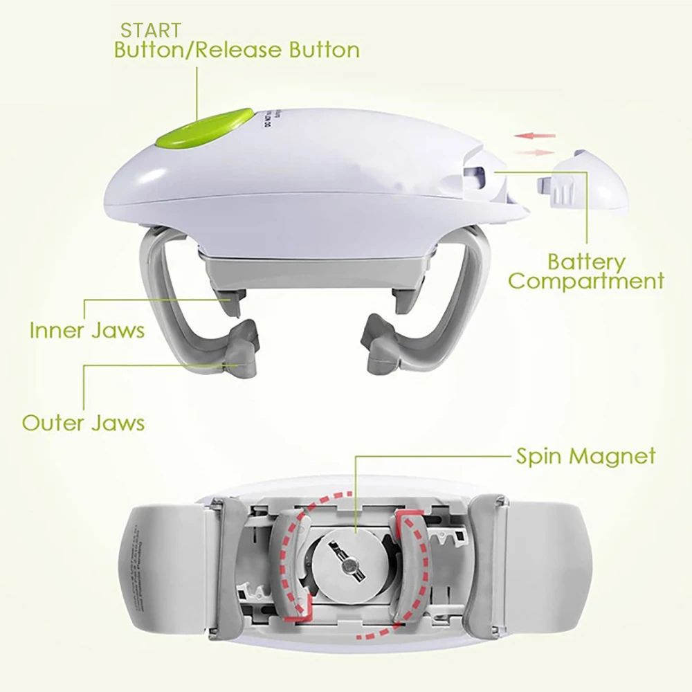 Fonctionnement à un bouton : placez simplement l'ouvre-bouteille sur la bouteille ou le pot, appuyez sur le bouton et laissez-le faire le travail ! Le moteur automatique ouvre le couvercle rapidement et sans effort.