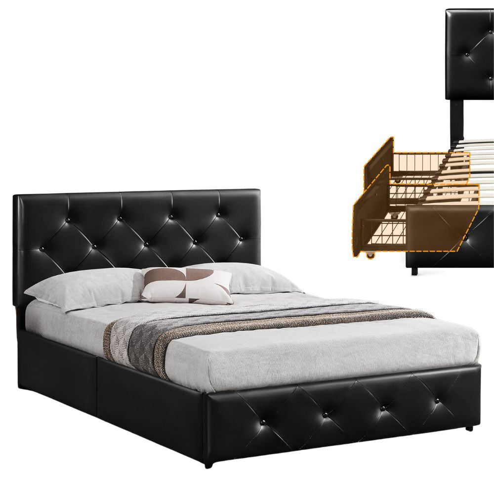 Polsterbett mit 4 Stauraum-Schubladen (140x200cm): Doppelbettrahmen mit Lattenrost | Schwarz