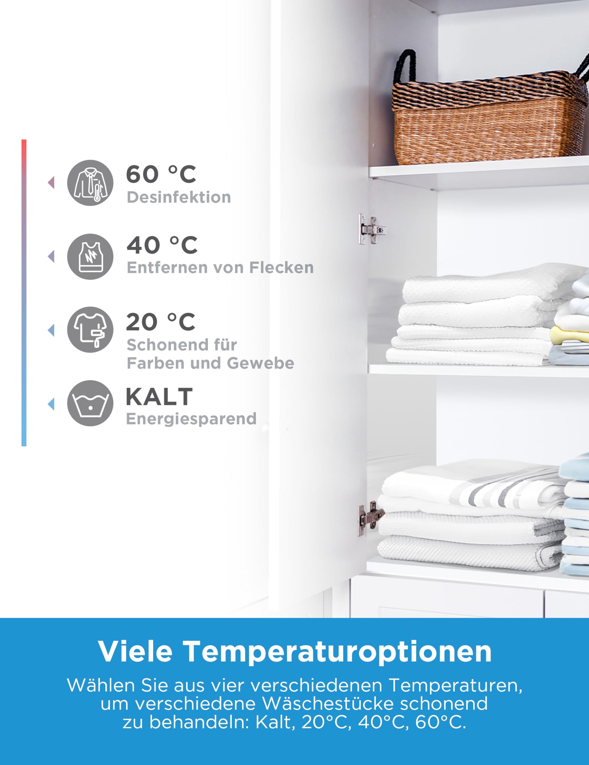 - 4 Temperaturstufen - Kalt, 20°C, 40°C, 60°C für optimale Pflege