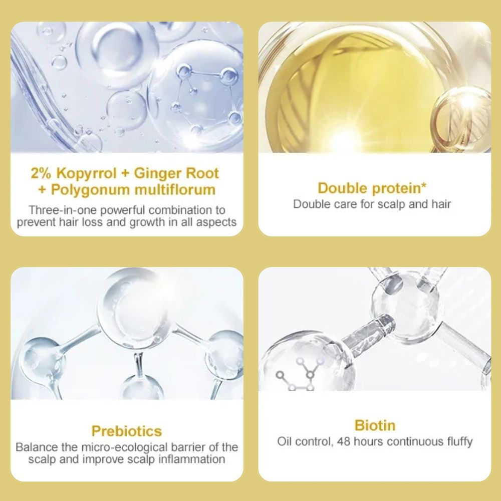 Ingwerwurzel & Polygonum multiflorum: Fördern die Durchblutung und aktivieren die Haarfollikel.