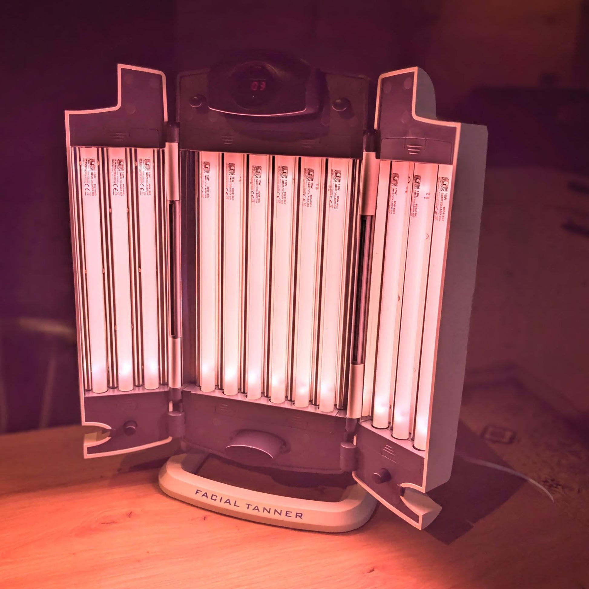 Aufklappbares Design mit Flügeltüren und Federknöpfen - ideal für gezielte Gesichtsbräunung