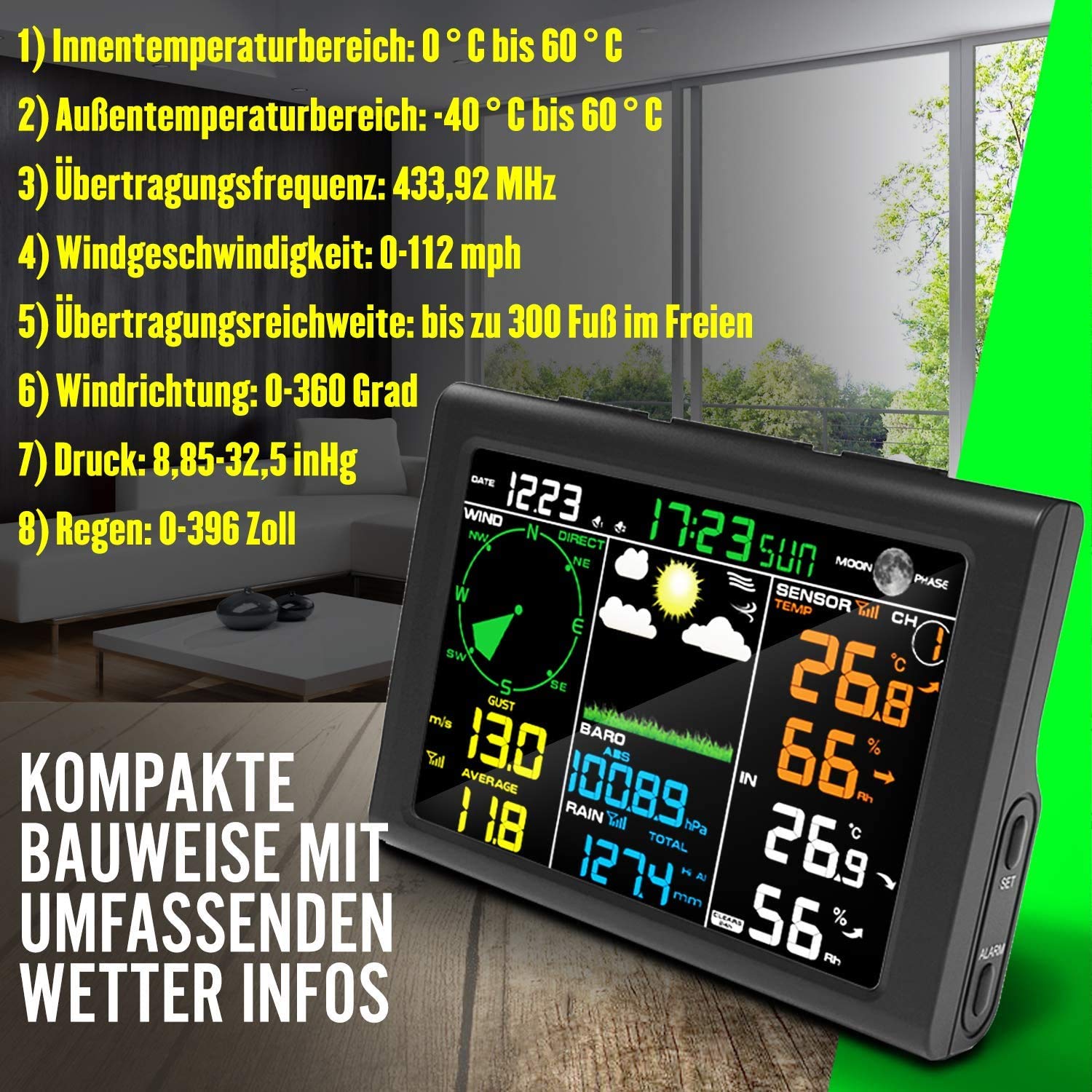 Umfassende Messungen: Innen- und Außentemperatur, Luftfeuchtigkeit, Windgeschwindigkeit und -richtung, Niederschlag, Windchill, Taupunkt sowie Luftdruck