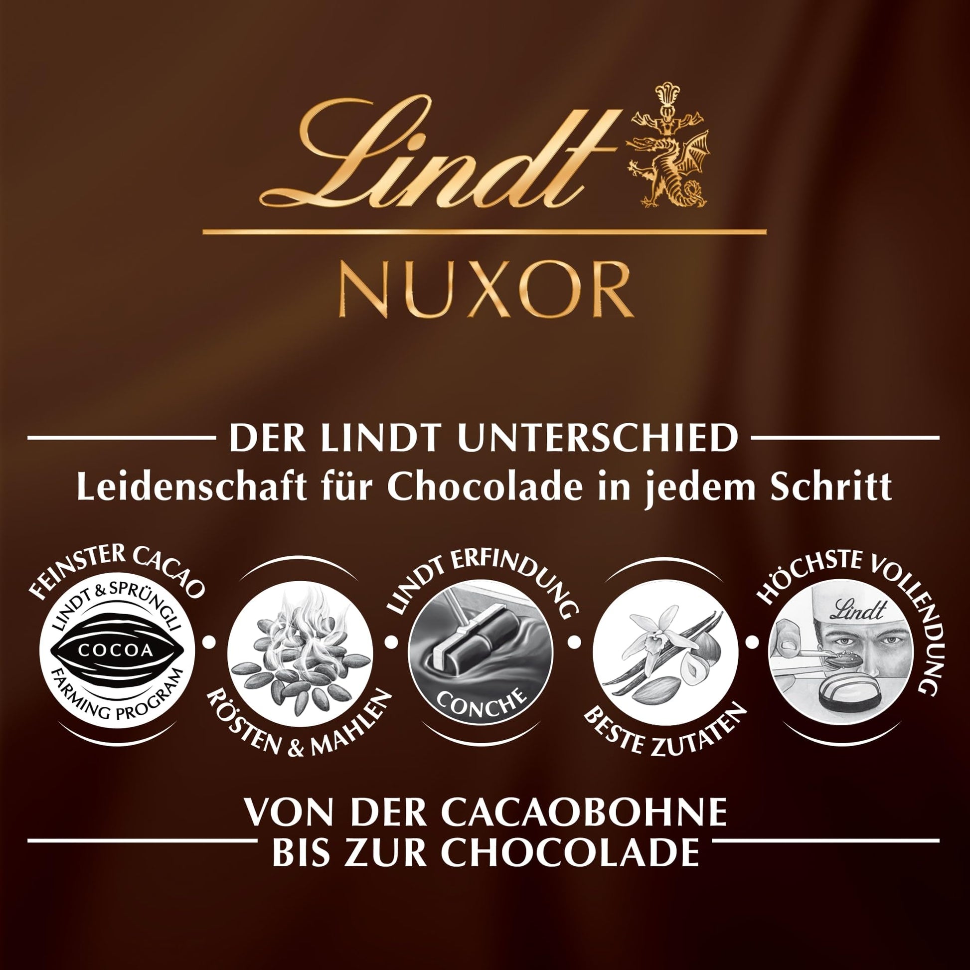 Entdecke die exklusive Komposition der Lindt Maîtres Chocolatiers: Die NUXOR Schokoladen-Spezialität vereint zartschmelzende Gianduja-Schokolade mit einem besonders hohen Anteil ganzer gerösteter Haselnüsse - für ein einmaliges Geschmackserlebnis mit knusprigem Biss.
